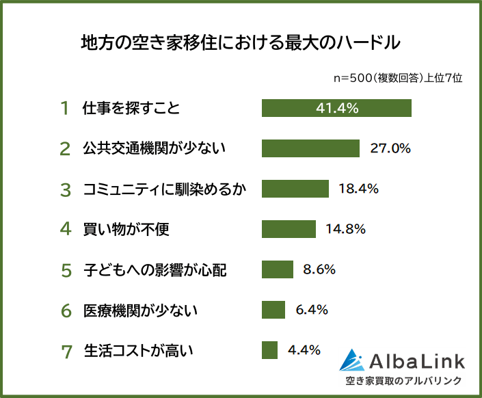 「地方の空き家移住で最大のハードル」を聞いたところ、ダントツは「仕事を探すこと(41.4%)」でした。